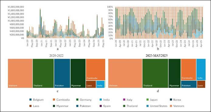 Figure 1. China’s Milled Rice Import Structure from 2020 to May 2025: (a) Monthly Import Value (RMB); (b) Country-wise Monthly Percentage Share; (c) Country-wise Proportion (2020–2022); (d) Country-wise Proportion (2023-May 2025); Data Source: China Customs.