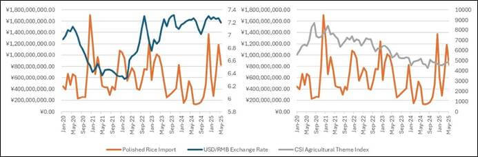 As a country with vast consumption demand and complex regional production patterns, China has traditionally depended on domestic rice cultivation to stabilize supply. However, over recent years, increasing openness to international grain markets and supply chain modernization have transformed China’s rice landscape. Particularly, the milled rice import has grown as a complementary supply channel, meeting diversified consumer demands and supporting price stability amidst periodic fluctuations in domestic production, which present both opportunities and challenges for the transformation of its rural agricultural supply chain. While international rice trade can stimulate rural economic upgrading, the underlying mechanisms through which trade interacts with domestic supply chain evolution remain underexplored. Existing research often isolates variables such as trade volume, price effects, or food security concerns, resulting in fragmented insights that oversimplify policy design. This reductionist approach neglects the dynamic interplay between government incentives, market procurement strategies, and smallholder upgrading behaviours. These interactions can either reinforce or undermine long-term supply chain resilience. Between 2020 and 2022, China’s milled rice imports remained relatively stable and regionally concentrated, sourced predominantly from ASEAN countries and South Asian exporters such as India and Pakistan. Since 2023, a noticeable shift has emerged that imports from traditional suppliers have declined, while India has significantly expanded its presence in the Chinese market. In contrast, non-Asian exporters have seen their share shrink, reflecting a broader trend toward regionalization and a preference for cost-efficient, high-quality supply channels. In examining China’s imports, the USD/RMB exchange rate is often used as a proxy for external price sensitivity and import purchasing power, while the CSI Agricultural Theme Index reflects broader trends in agricultural sector performance and market sentiment. These indicators are commonly employed to interpret fluctuations in trade volumes through financial and macroeconomic lenses. Figure 1 presents the milled rice import structure from 2020 to May 2025, with the data obtained from Customs Statistics, General Administration of Customs of the People’s Republic of China (http://stats.customs.gov.cn/). However, as illustrated in Figure 2, the expected directional correspondence between these variables and China’s milled rice import trends does not prominently emerge.