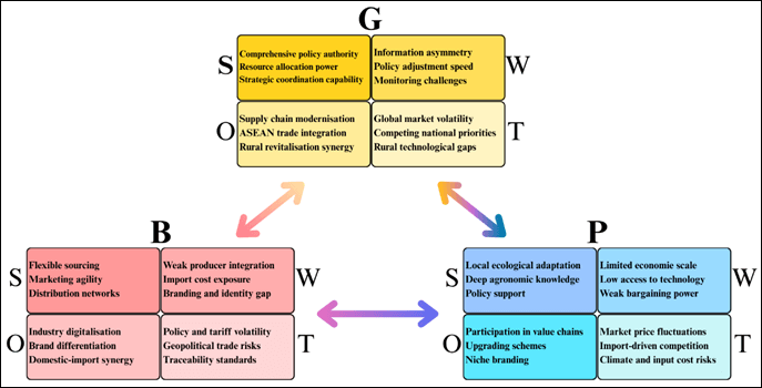 This study addresses the gap by integrating SWOT analysis into a tripartite evolutionary game model that simulates the co-adaptation of government regulators, market-based procurement agents, and smallholder producers. The model incorporates data-informed parameters to reflect realistic decision-making processes, enabling the capture of strategic adjustments and emergent equilibria over time. By framing stakeholder interactions as part of a complex adaptive system, the approach reveals how aligning incentives can generate self-reinforcing positive feedback loops. These loops, in turn, promote cooperative behaviours that enhance supply chain stability, inclusivity, and resilience against both domestic and global market pressures, reframed by the SOAR framework as dynamic levers in a complex adaptive system. The model captures how decisions made by each stakeholder interact over time to influence broader supply chain trajectories. Its structure is aligned with China’s rural development goals. Therefore, the study offers a coherent and dynamic lens through which to assess the mutual influence of trade, governance, and agricultural modernization, guided by two primary questions: RQ1: How do government incentives, market procurement strategies, and domestic upgrading behaviors evolve together within China’s rice import ecosystem? RQ2: How can collaborative strategies among these stakeholders promote resilience and high-quality development in China’s rural agricultural supply chain?