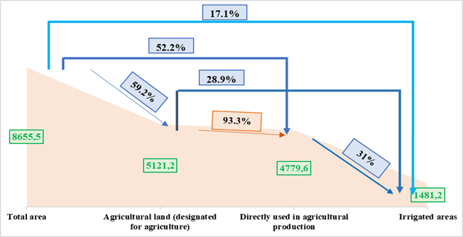 Figure 1. Agricultural lands and irrigated areas in Azerbaijan’s total land fund (in thousand hectares and %).
