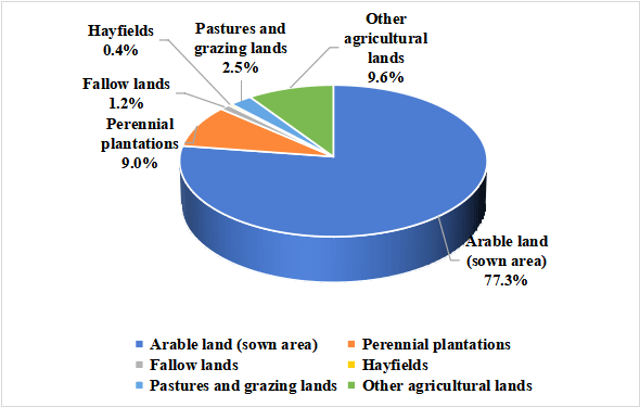 According to information of State Committee for Land and Cartography of the Republic of Azerbaijan (2024), the land suitable for agriculture in Azerbaijan amounts to 4,779.6 thousand hectares, of which 1,873.9 thousand hectares (39.2%) are arable land, 205.0 thousand hectares (4.3%) are perennial plantings, 54.3 thousand hectares (1.1%) are fallow lands, 108.9 thousand hectares (2.3%) are hayfields, and 2,305.5 thousand hectares (48.2%) consist of pasture and grassland lands. Among the arable lands, 948.3 thousand hectares are used for cereals and legumes, 93.7 thousand hectares for cotton, 2.7 thousand hectares for tobacco, 49.5 thousand hectares for potatoes, 61.2 thousand hectares for vegetables, and 17.2 thousand hectares for melon crops. Among the perennial plantings, 134.5 thousand hectares are orchards, 49.7 thousand hectares are vineyards, 6.4 thousand hectares are tea plantations, and 14.5 thousand hectares are other perennial crops.