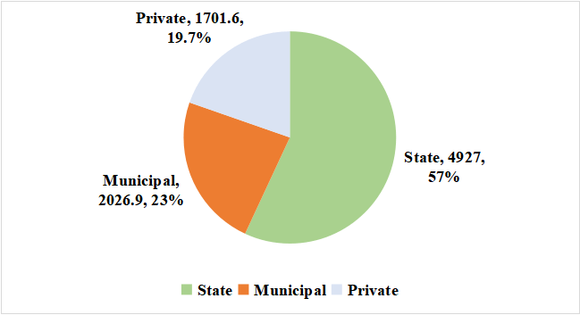 According to the Constitution of the Republic of Azerbaijan, land ownership is divided into state, municipal, and private property. The total land fund amounts to 4927.0 thousand hectares, of which 56.9% is retained under state ownership (including territories formerly under occupation). Out of the total land reserves, 2026.9 thousand hectares, or 23.4%, have been allocated to municipal ownership, while the remaining 1701.6 thousand hectares, or 19.7%, have been granted to private ownership. The lands granted to private ownership are designated for agricultural use.