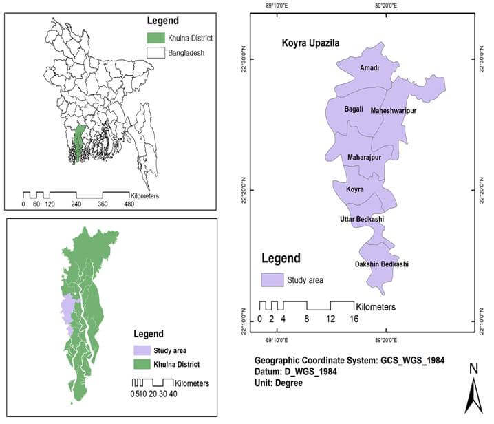 The study was conducted in Koyra Upazila of Khulna District (Figure 1), which is located in the southwestern part of Bangladesh. Koyra Upazila is situated in close proximity to the Bay of Bengal. This area faces significant agricultural vulnerability due to climate change (Iqbal & Aziz, 2022). Fluctuating temperature, rainfall, and humidity, along with hot and humid rainy seasons (Chowdhury et al., 2020), negatively impact the agricultural settings in this region. Multiple environmental hazards, including cyclones, flooding, storm surges, waterlogging, and soil salinity, also affect crop production in this region (Biswas et al., 2024; Iqbal & Aziz, 2022).